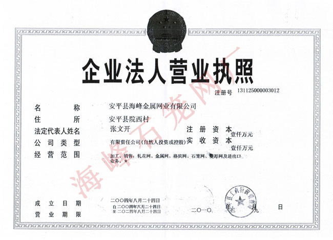 - 安平縣海峰金屬網業有限公司 安平縣海峰金屬網業有限公司位于中國著名的“絲網之鄉”——河北省安平縣,是具有拉絲織網、焊接、剪裁、噴塑、浸塑成品等一整套生產工藝的專業化廠家。本公司經過多年來的順勢發展,現已擁有廣闊的生產廠房和優良的辦公環境,占地8500平方米,在廠職工100余人。擁有高深的技術人員,高端的生產設備,全自動的機械化生產流水線,站在了軋花網、石籠網同行業的頂端。 查看更多>>